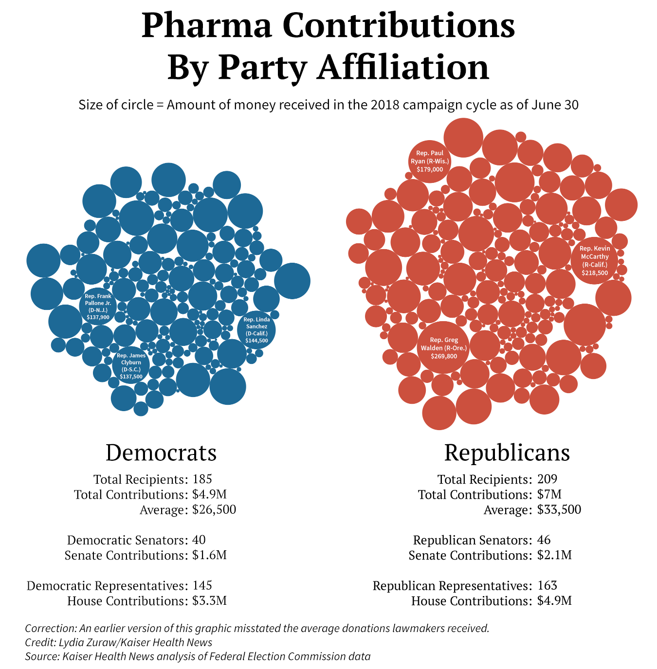 Dall’inizio dello scorso anno, 34 legislatori hanno ricevuto ciascuno più di 100.000 dollari da aziende farmaceutiche. Un nuovo database di Kaiser Health News mostra che due di questi – il Rappresentante Greg Walden dell’Oregon, un presidente chiave del comitato repubblicano, e Kevin McCarthy della California, il leader della maggioranza della Camera dei Rappresentanti – hanno ricevuto ciascuno più di 200.000 dollari.