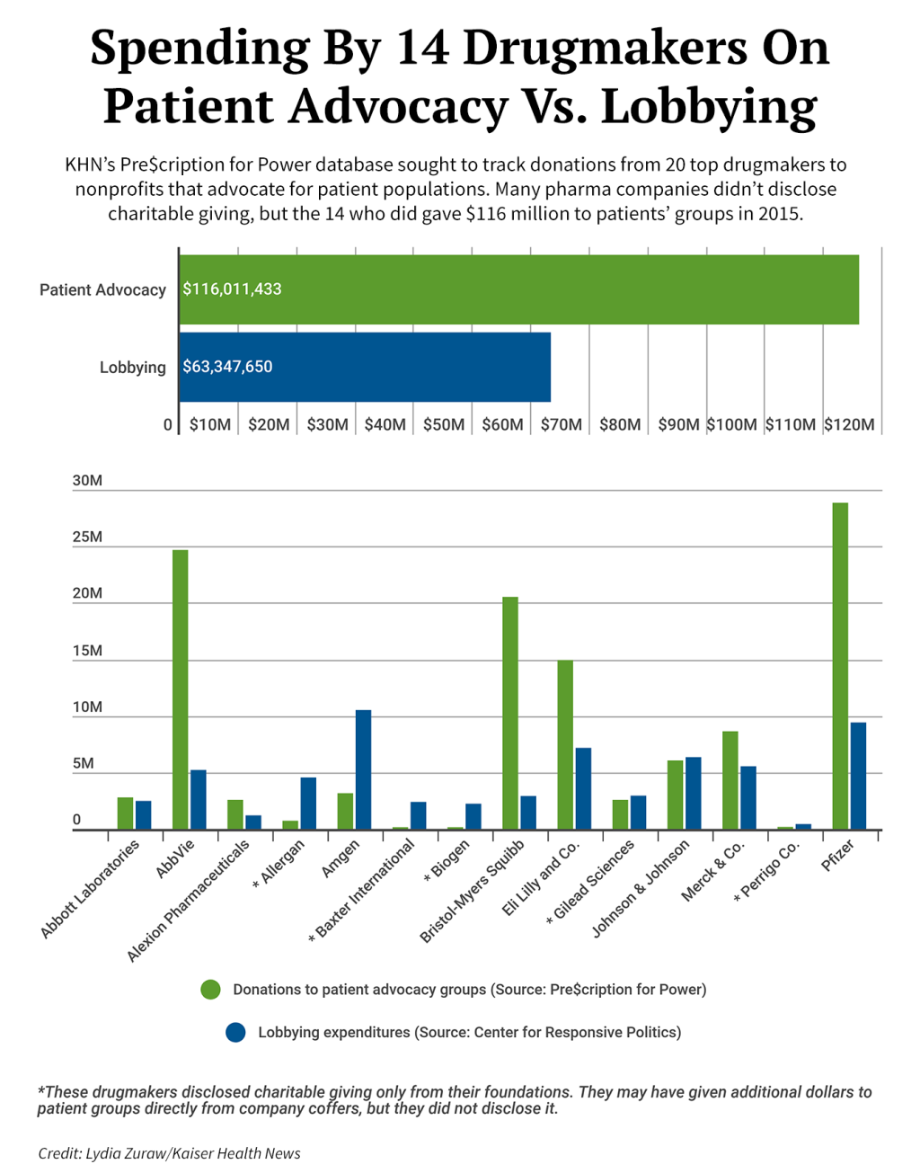 Una precedente indagine di Kaiser Health News, «Pre$cription for Power», ha esaminato le iniziative di beneficenza da parte dei più importanti produttori di farmaci e ha scoperto che 14 di loro hanno donato un totale di 116 milioni di dollari a gruppi di difesa dei pazienti solo nel 2015.